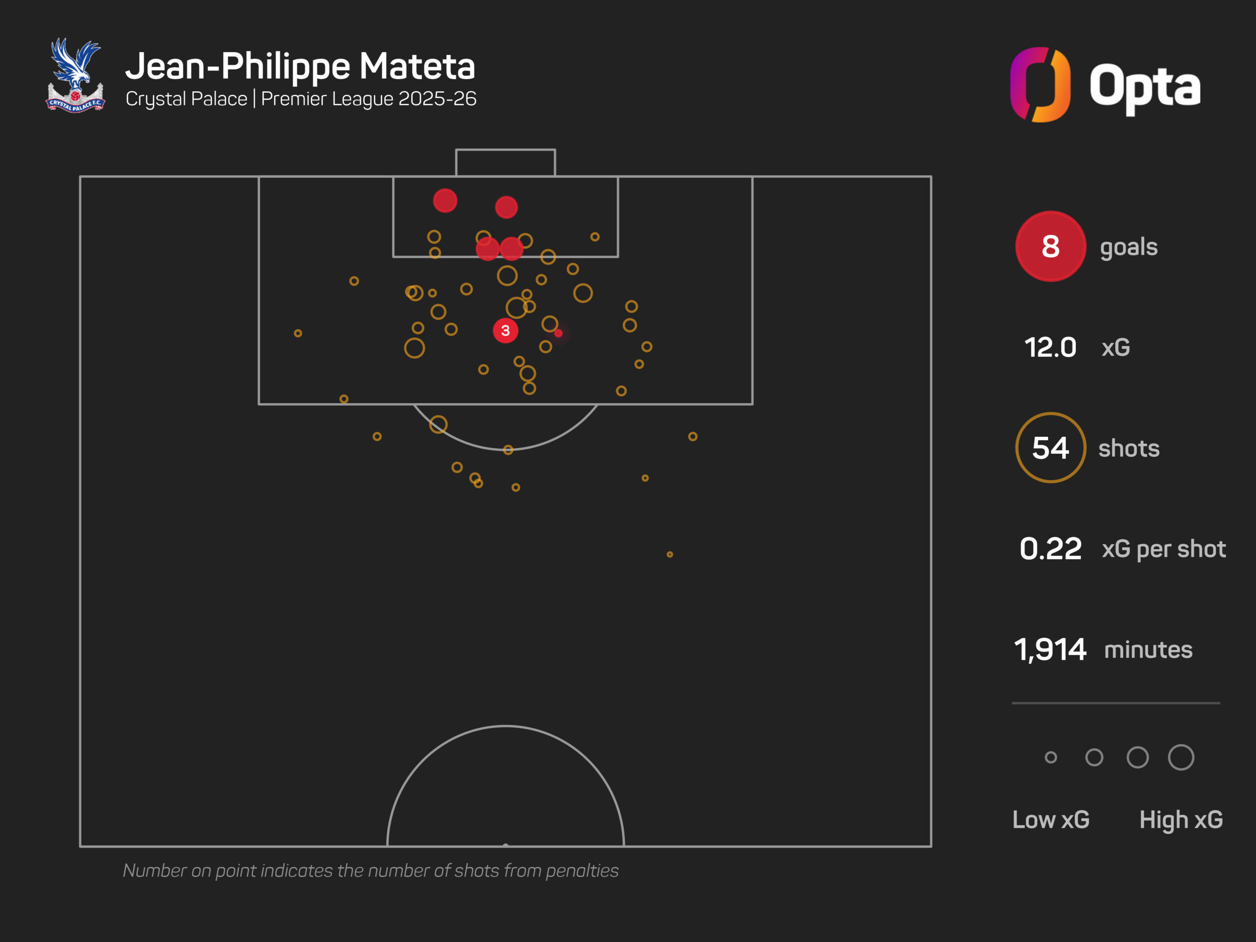 Mateta has scored eight Premier League goals this season, though he has underperformed his 12.0 expected goals (xG).