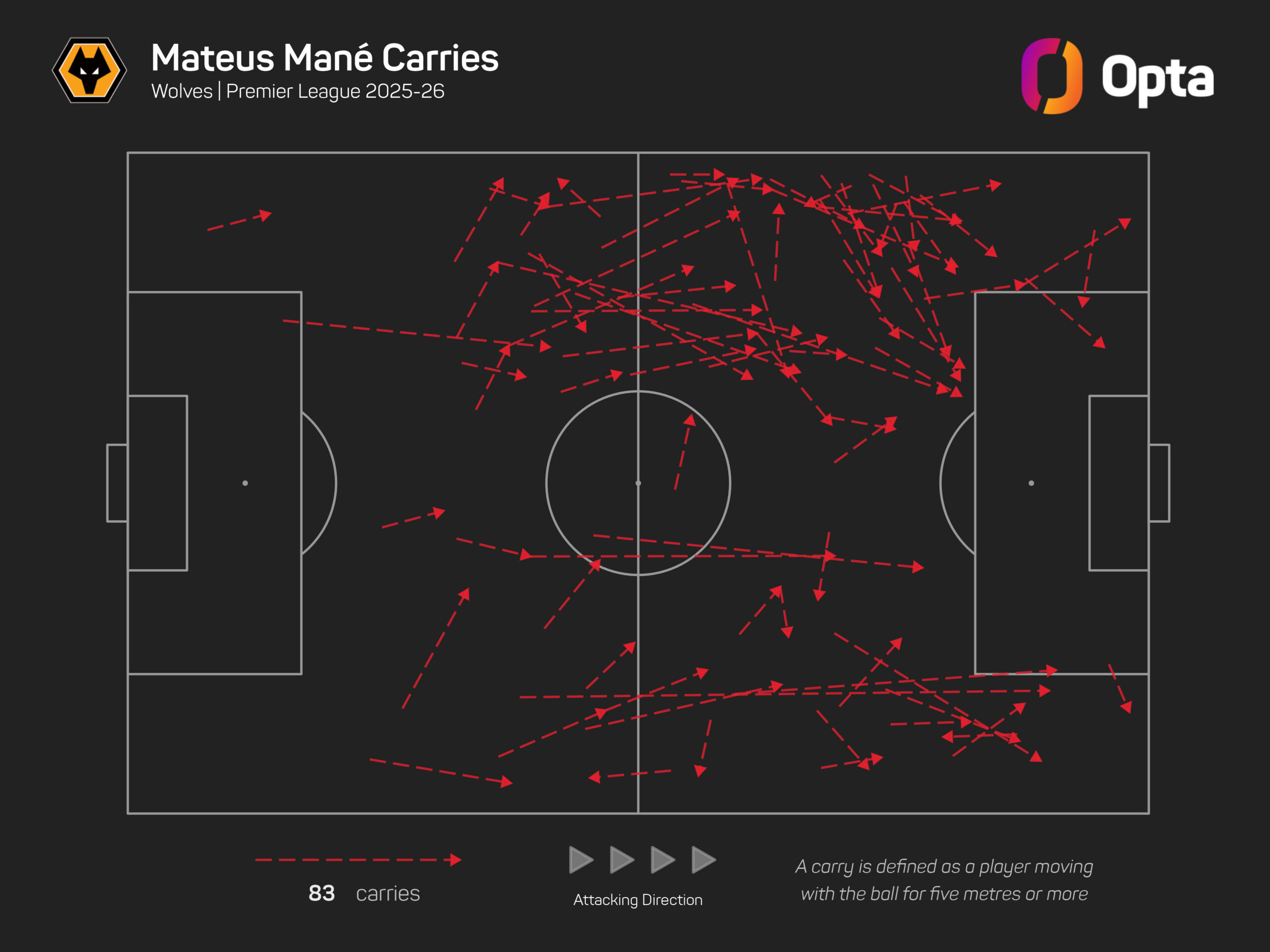 Since making his first Premier League start against Liverpool on December 27, Mane has attempted almost twice as many dribbles as any other Wolves player (26 – Joao Gomes is second with 14).
