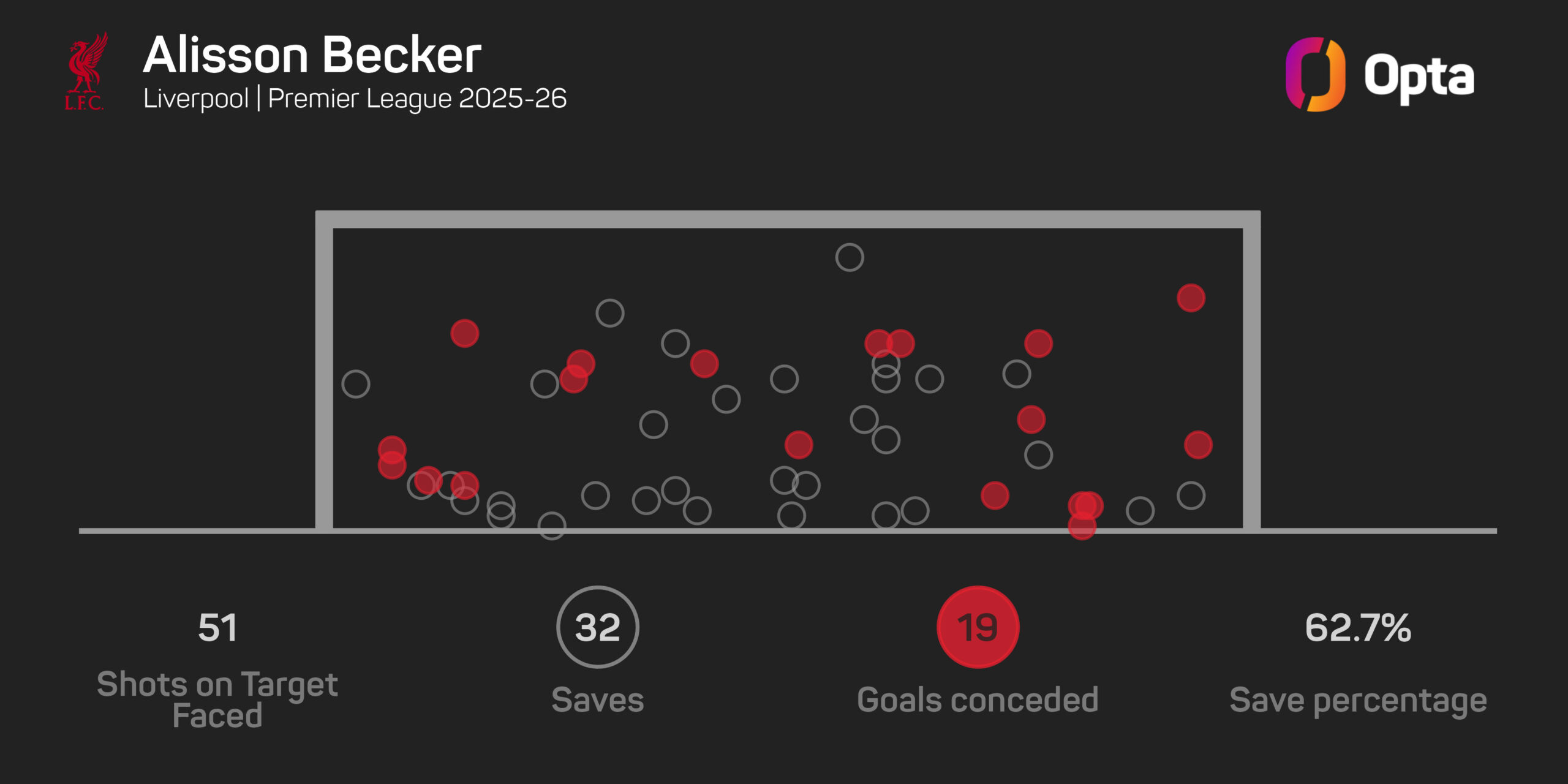 Alisson has saved 32 of the 51 shots on target he has faced in the league this season, conceding 19 goals.