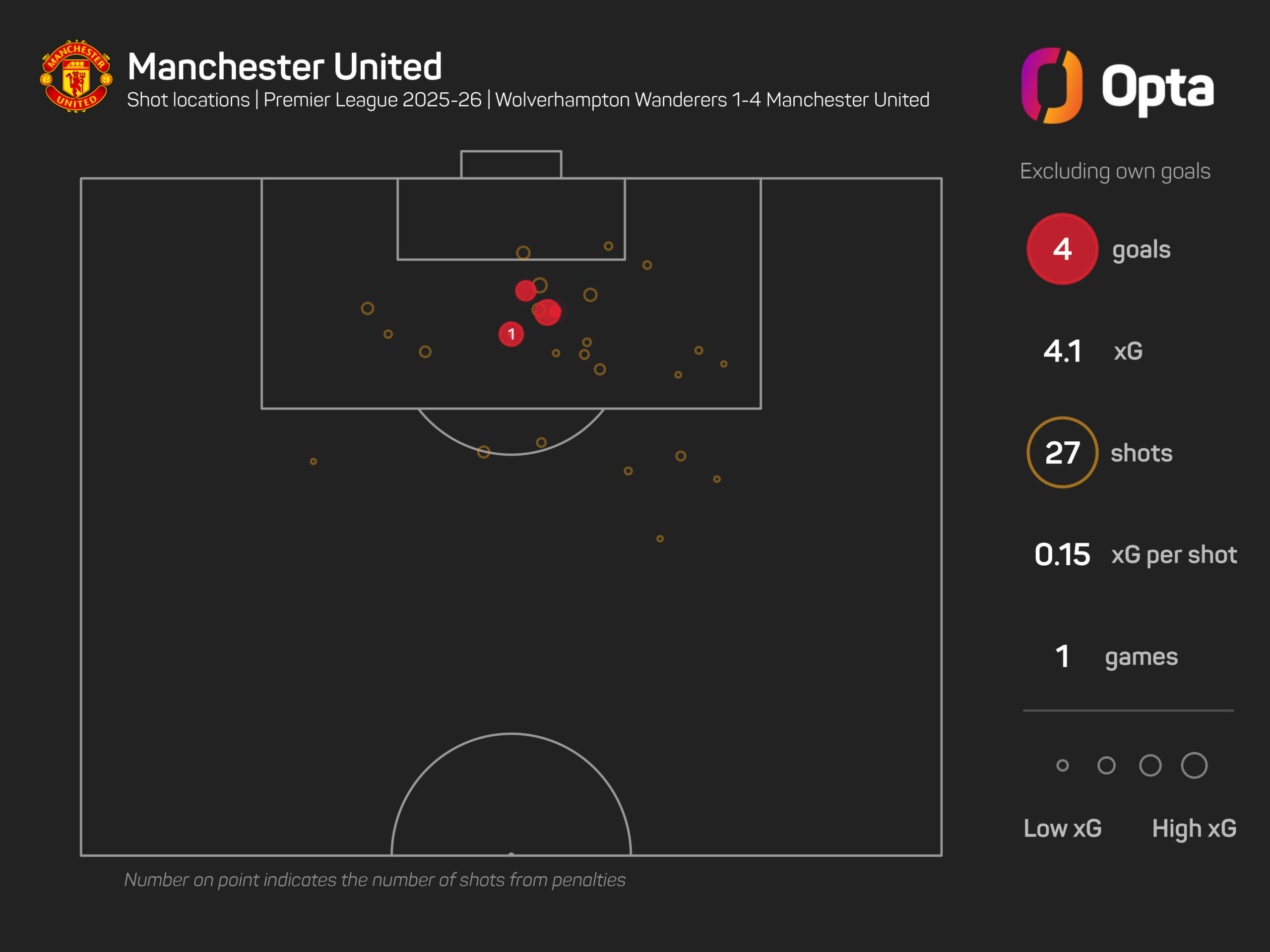 The Red Devils mustered 27 shots overall, their most in a single Premier League game under Amorim. They last attempted more in December 2023, against Chelsea (28).