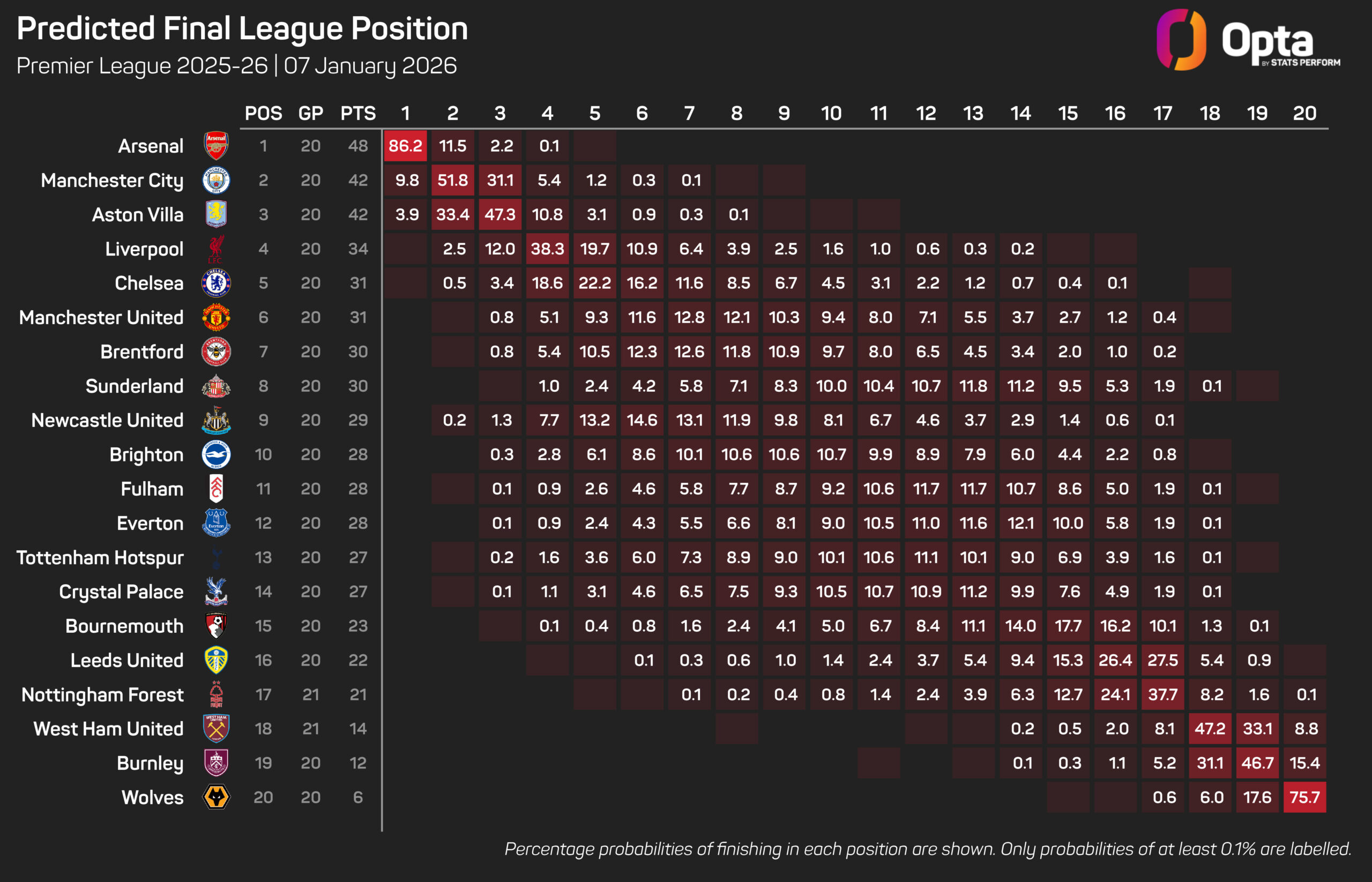 Arsenal are assigned an86.2% chance of sitting top of the pile according to the Opta supercomputer, with only Manchester City (9.8%) and Aston Villa (3.9%) believed to be inwith a chance of lifting the title this season in its simulations.