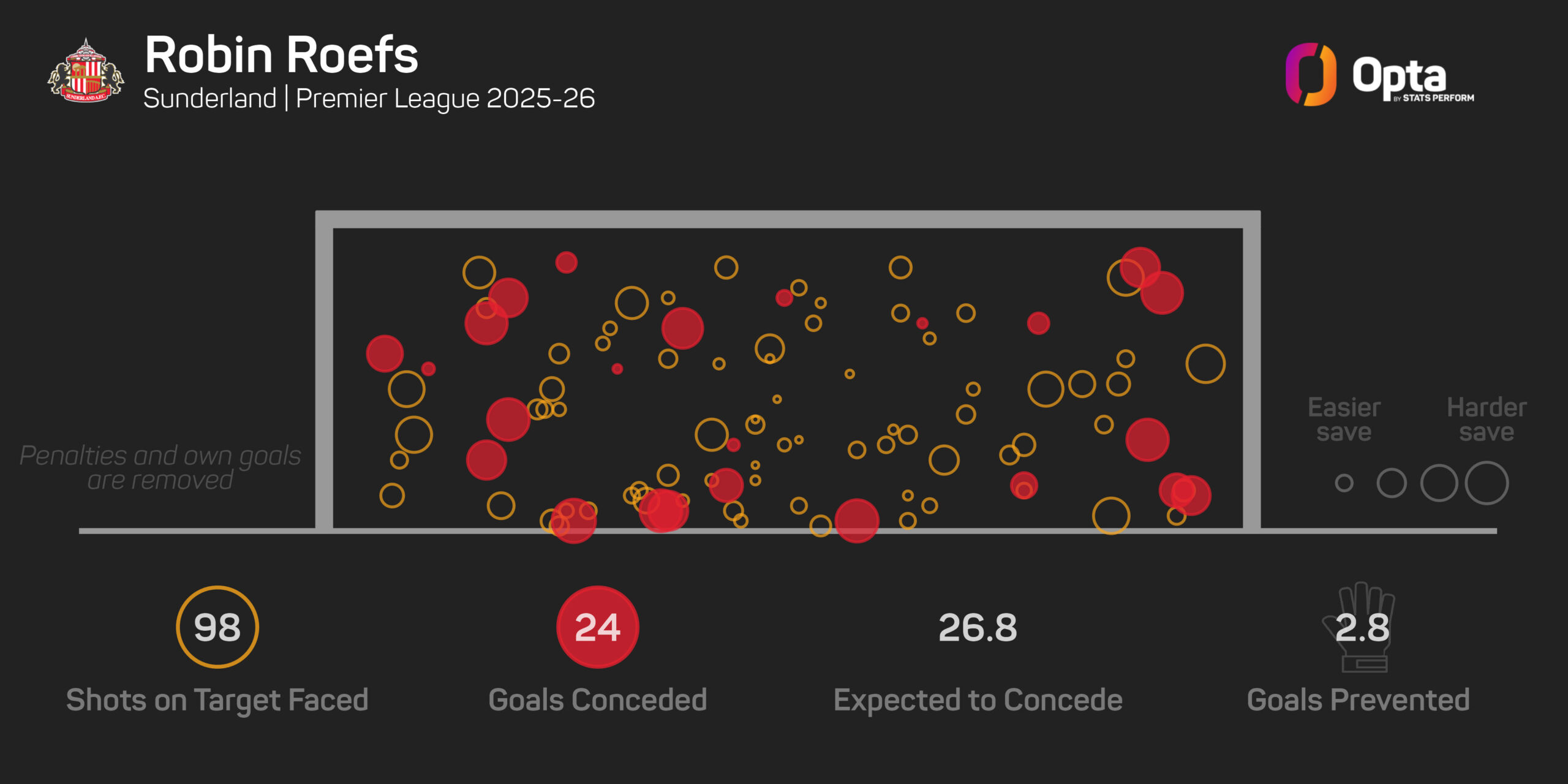 Robin Roefs has made the third-most saves (76), has the second-highest save percentage (74.3%) and the joint-fifth most clean sheets (eight) of any goalkeeper in the Premier League this season.