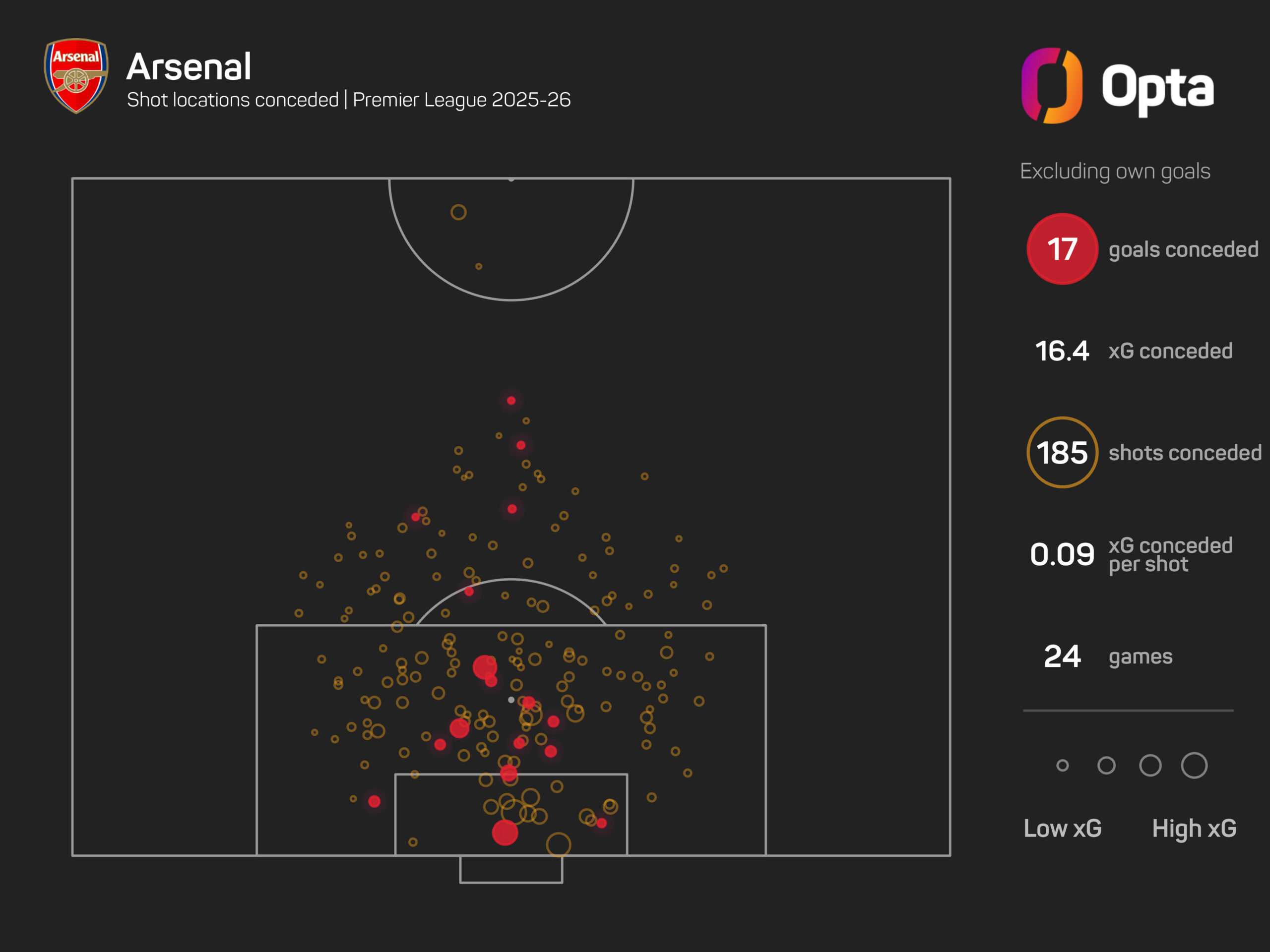 Arsenal have faced 16.4expected goals against (xGA) this term, underperforming their total slightly. They have faced 185 shots in total, with 50 of those on target.