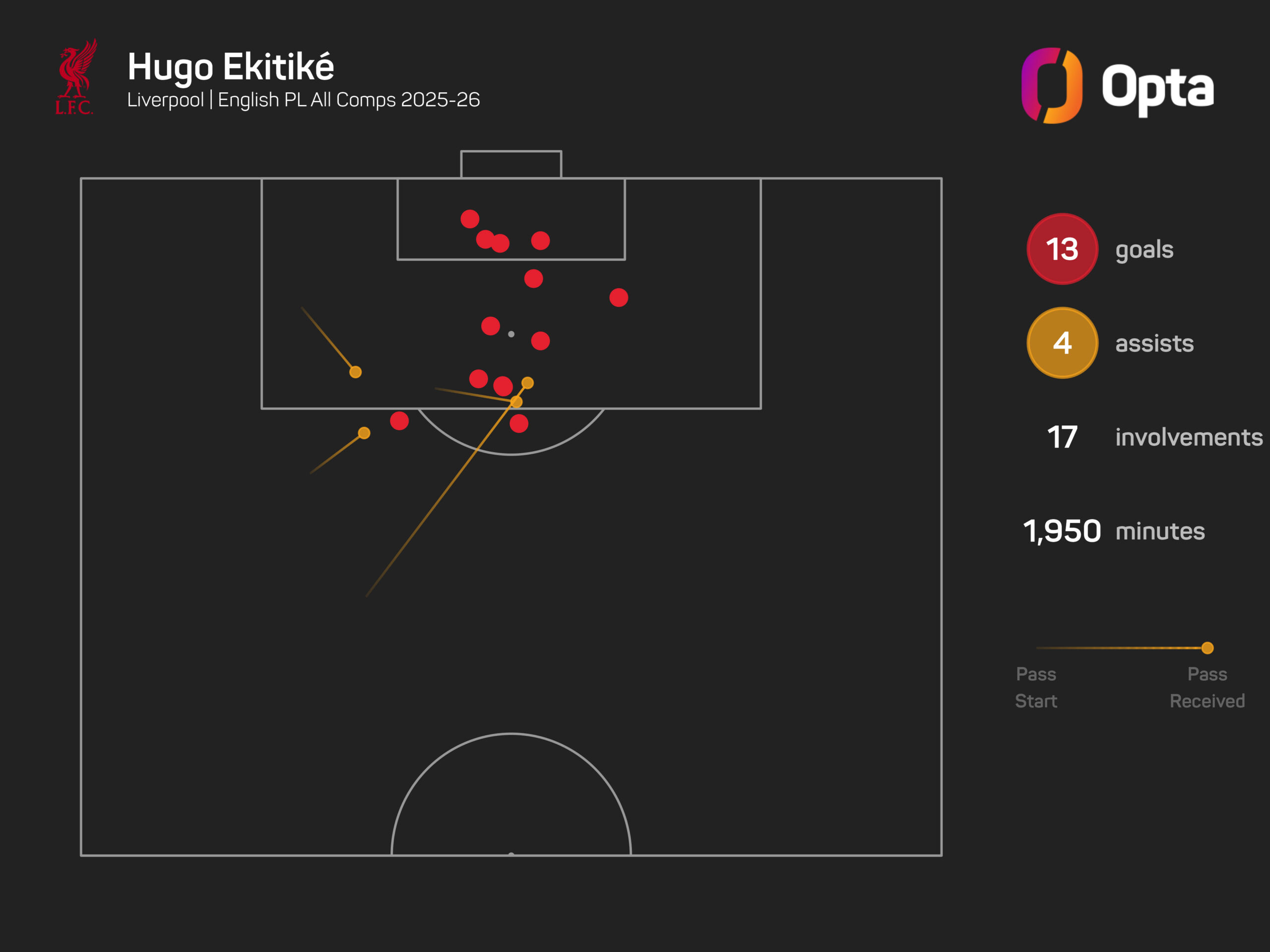 The Frenchman has been directly involved in more goals than any Liverpool player in all competitions this season (17 – 13 goals, four assists).