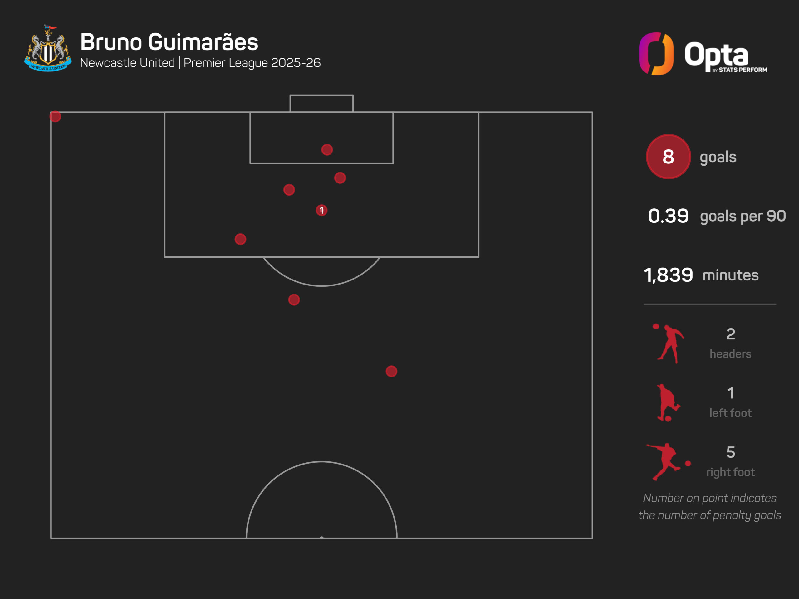 In the Premier League this season, no player has scored more goals (eight), won more tackles (31) or created more chances (32) for Newcastle than Guimaraes.