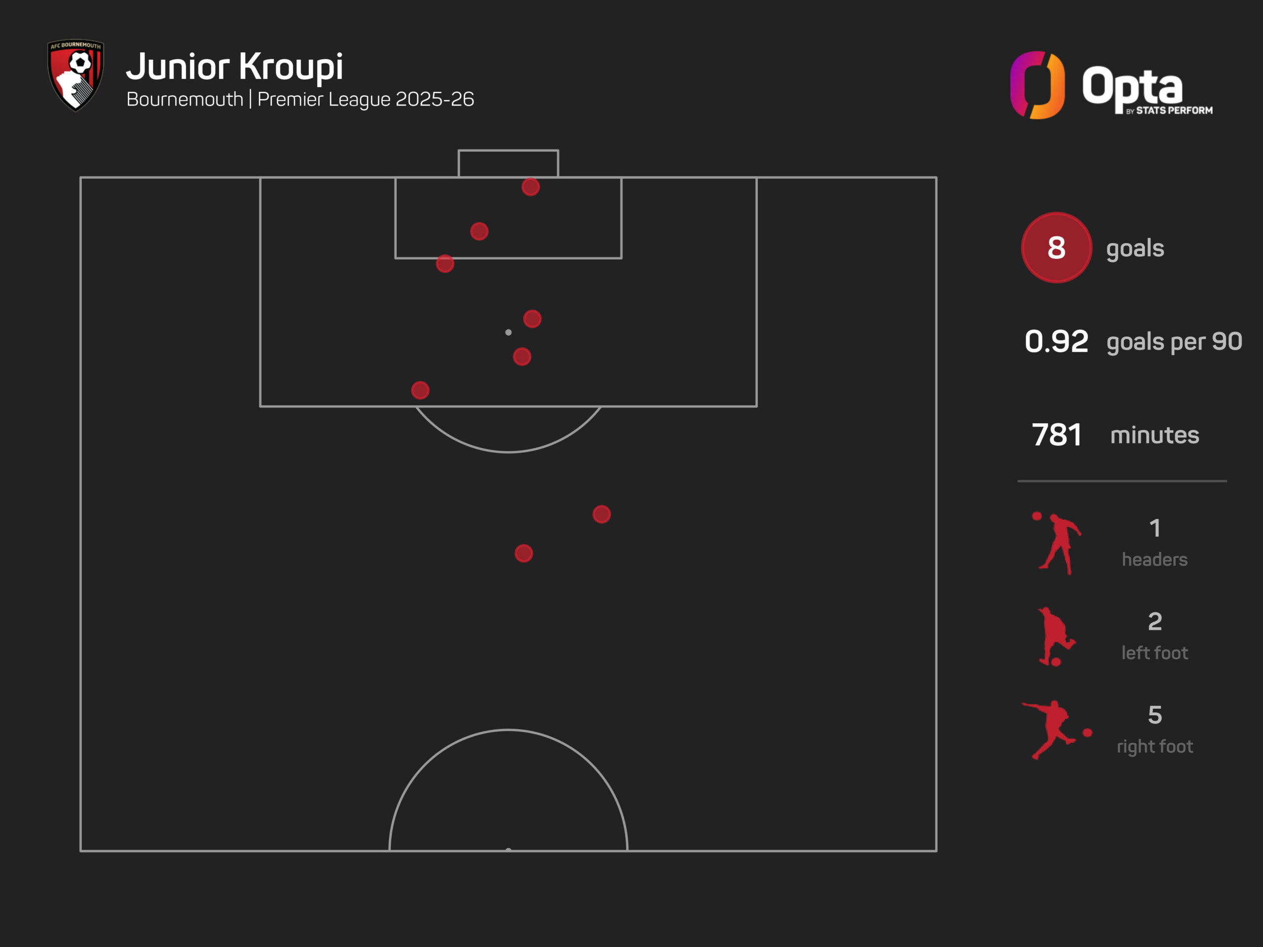 Bournemouth teenager Kroupi has the best shot conversion rate of any player to have 10 shots in the Premier League this season (38.1%).