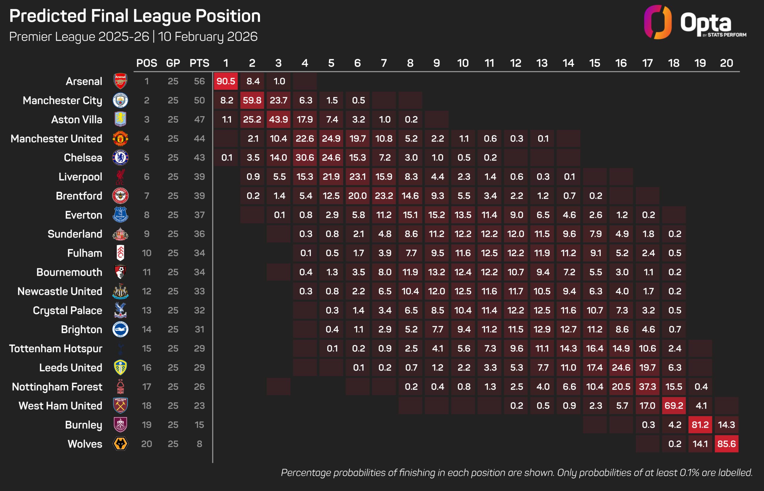Liverpool are assigned a 21.7% chance of finishing in the top four, with Aston Villa (70.2%), United (35.1%) and Chelsea (48.2%) all better fancied in the Opta supercomputers data-led simulations of the 2025-26 season.